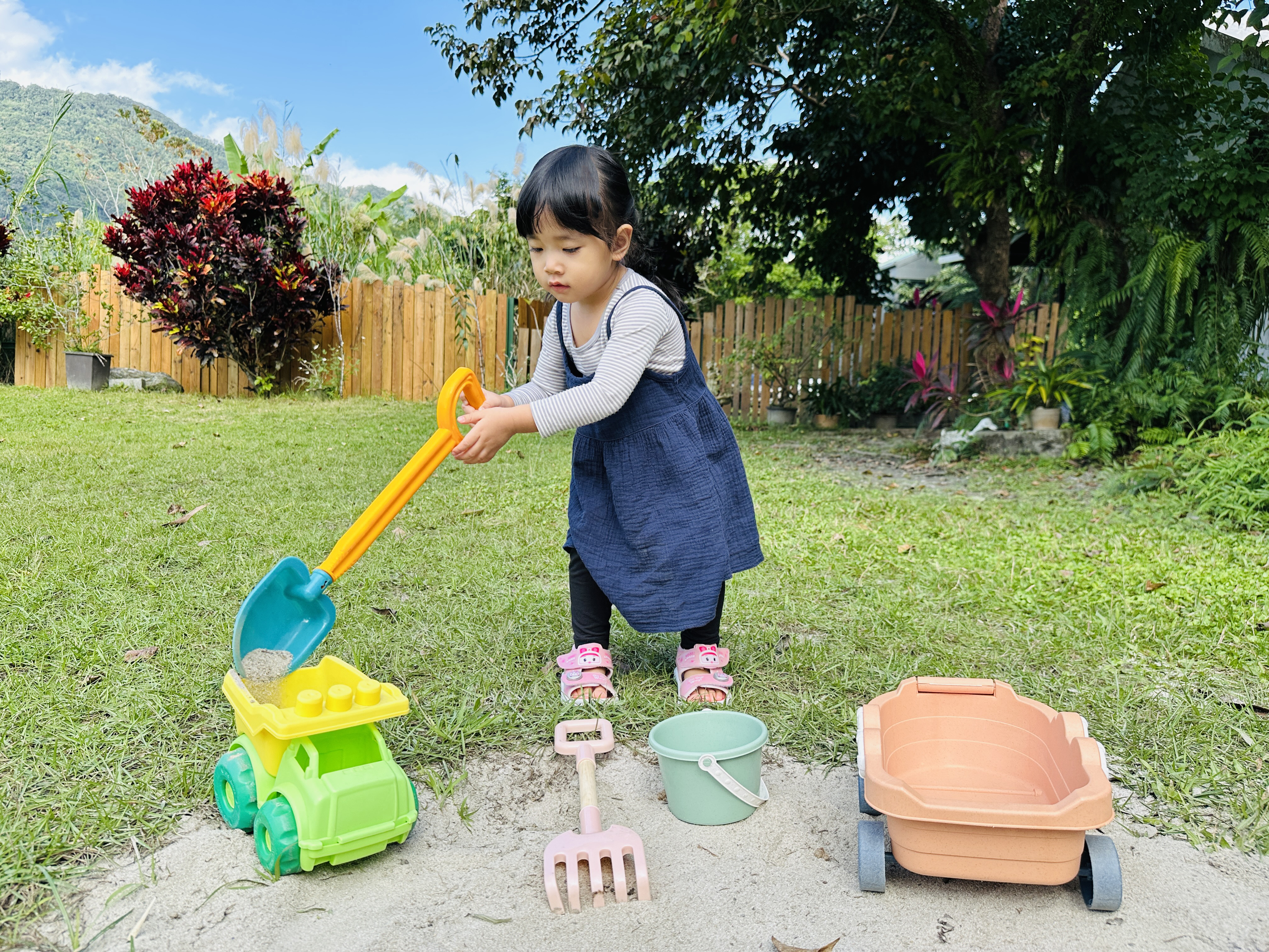 戶外的大草皮區藍天白雲配上整片綠地,視覺真的很舒服,這裡還設有一個中型沙坑,小朋友可以很專心地挖沙、玩耍,大人就在旁邊看著也很放鬆。
