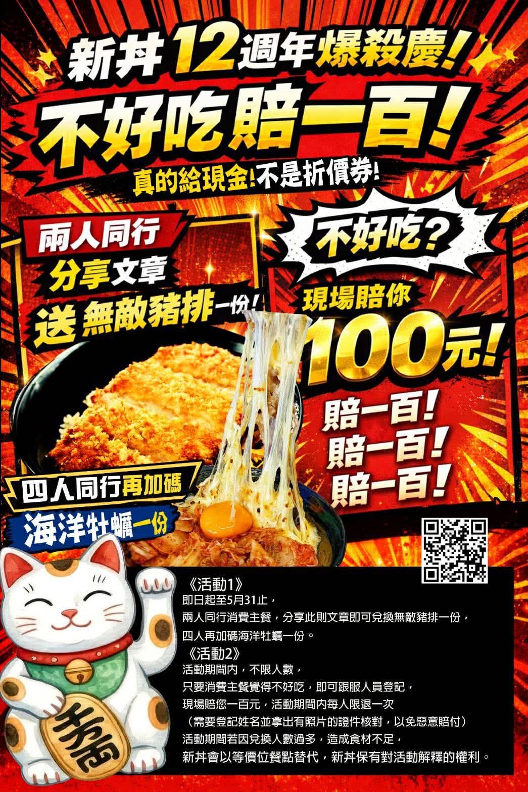 最後補充一下他們最近的十二週年活動資訊,如果剛好有安排要來,可以順便參考看看。活動期間到5月31日,只要兩人同行點主餐,分享指定文章就可以兌換豬排,四人同行還會再加碼牡蠣。另外還有一個蠻有話題性的活動,就是如果覺得不好吃,可以現場登記賠100元(每人限一次),整體活動滿吸引人的,也滿有話題性的。