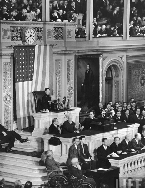 在一個暮秋雨後的周末,我與內人來到了這所設立於1814年華府最古老的衛理公會教堂,用力掀開一扇塵封已久的彩繪玻璃窗,打上燈光,宋美齡的彩繪肖像出現在眼前。玻璃窗中的宋美齡,穿藍色中式袍裙,左手置於胸前,右手往右下方展開,掌心朝前作給予狀。她面容典雅,帶有悲天憫人的氣質。那一剎那,我看到了1943年2月,年方45歲、風華正盛、雍容富貴的宋美齡,受羅斯福總統邀請赴華府國會山莊,向美國國會參眾兩院500多位議員演說。當我看到宋美齡的彩繪玻璃肖像時,真是為之感動不已。