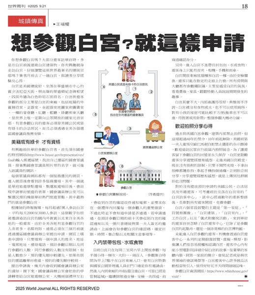 你想參觀白宮嗎?大部分的遊客來華府時,都是在白宮前面或後面遠眺著白宮建築物。但你有興趣親身走訪白宮,仔細瀏覽這座世界最著名的總統宮邸嗎?筆者今年暑假去了一趟白宮,也許可以與各位讀者分享 一些經驗及心得。