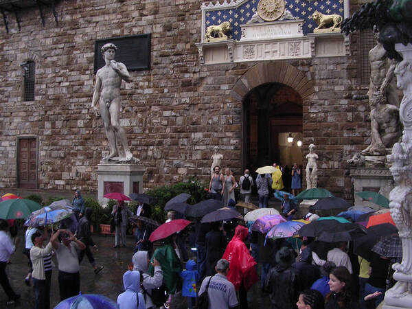 到翡冷翠的時候,步出火車站,剛好下起傾盆大雨。這是一場少見的大雷雨,從廣場四周投射的燈光,可以清楚看見空中狂亂飛舞的雨絲。我倆坐在傭兵涼廊底下,一座叫不出名字的皇帝雕像旁邊,從傘與傘的交界處,看著涼廊內眾多著名雕像靜靜地佇立雨中。