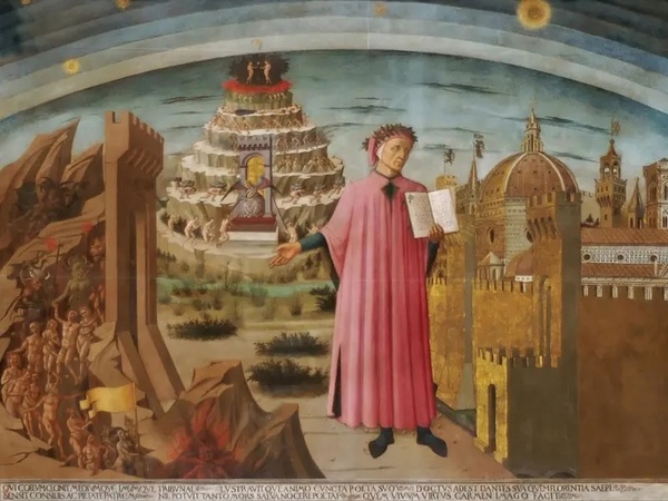 聖母百花大教堂裡有一幅畫像深刻地攫住了我們的心,那是一張既憂慮又柔情的臉,他身著長袍,頭上戴著桂冠,一手拿著「神曲」,一手向人解說天堂與地獄的景象,啊!我們知道了,那就是「但丁的畫像」,但丁的故居隱在附近巷弄裡。美麗的翡冷翠,給予詩人源源不絕的靈感,而詩人更以精萃的詩文回饋古城,使她益添豐華;斜風細雨中,漫步小橋邊,彷彿看見但丁與貝特麗絲,相遇在維琪奧橋上的款款儷影。