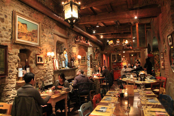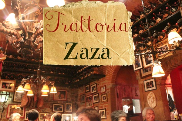 Zaza牛排餐館,推開門進入,已經是滿室撲鼻的蒜頭香、麵餅香、洋蔥番茄香。這個外表看起來不太起眼的餐館能高朋滿座一定也有它的獨特之處,便試試看吧。入座後,侍者會自動端上切片麵包。這種源於托斯卡尼的義大利麵包皮厚中軟,可以抹上黃油後享用。然後另有一小碟切丁番茄蓋烤的大蒜麵包,色香味俱全,而我們還沒開始點菜呢!標準的翡冷翠式三道菜單。冷盤前菜以烤蔬菜沙拉為主,紅椒朝鮮薊節瓜火腿;主菜則是炭烤托斯卡尼牛排;甜品必是提拉米蘇。