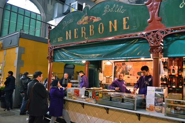翡冷翠是很小可是很豐富的古都,文藝復興時期的餐廳一直延續經營下來,它的文藝氣息及悠閒風情吸引著無數的文人騷客。翡冷翠保存著許多文藝復興時期的藝術資產,一般住家建築也儘量維持原始風貌。我們漫步在中古世紀的街道時,剛好遇到一對香港來的夫妻,看到我們用中文對話,就很熱情的和我們攀談了起來。這對夫妻是美食愛好者,到世界各地旅遊都會去吃當地著名的餐廳和食材,經過他們的提點,我們才知道牛肚堡、丁骨牛排、提拉米蘇,是最常被提到的翡冷翠三寶。我們沿著河邊走,過了一個橋口轉入小街裏,再從聖克羅斯教堂步行到希諾利亞廣場。這是名副其實的翡冷翠市集。我們快步走到靠近車站附近的中央市場,找到了一家他們推薦超有名的百年老店Nerbone牛肚堡專賣店。