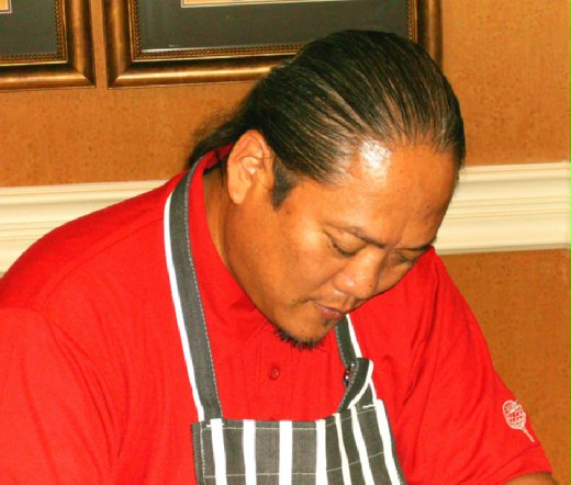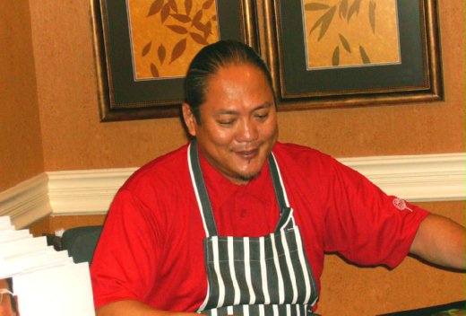 在將近一個小時的等候時間﹐和其他的粉絲們聊著Morimoto的菜餚和做菜風格﹐才知道大部份的人都是他的忠實觀眾﹐一路從日本鐵廚看到美國鐵廚。有一個美國女生還去上過日本料理課﹐會做壽司。可是翻過了Morimoto的食譜之後﹐我們都同意﹐Morimoto的菜我們做不來﹐格調太高了﹐還是看看過過乾癮就好。