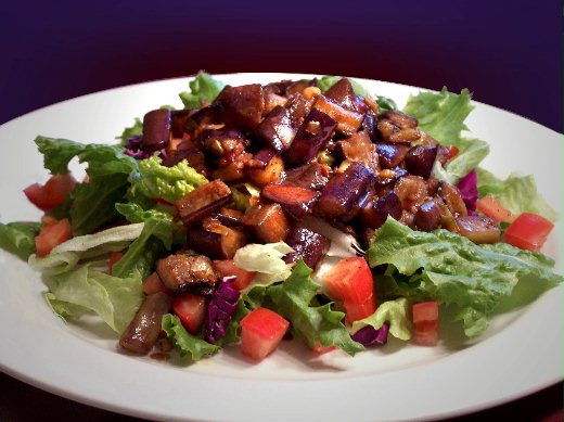 沙拉不一定吃西式﹐魚香茄子配沙拉吃起來很清爽﹑很夠味﹑很健康。