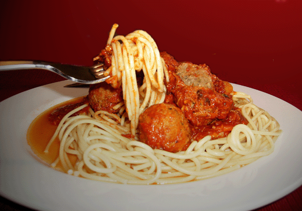 麵煮好﹐淋上醬汁﹐加上肉丸子﹐就是香噴噴﹐原味正宗的義大利麵