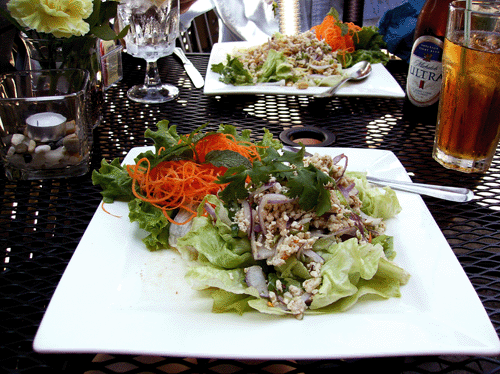 午餐要清淡﹐開車才不會打磕睡﹐我們都點了雞肉沙拉。白色的盤子﹐襯得菜蔬鮮艷艷的﹐另人胃口大開。雞肉切末﹐香香辣辣的﹐濃濃的泰國味﹐吃得我們眉開眼笑。![]()