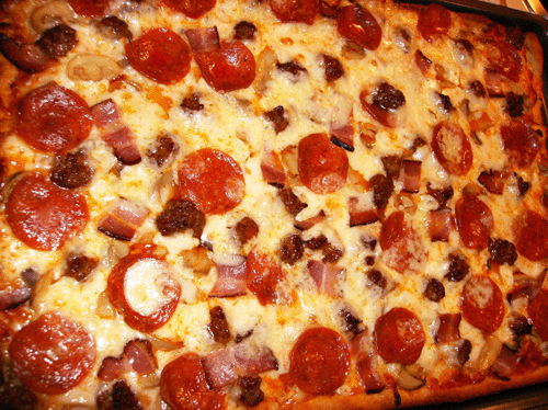 「可以嗎﹖實在是因為妳做的Pizza太好吃了﹐旁邊的皮有點脆﹐中間的餅皮很有韌性﹐很有嚼勁﹐上面那層香腸和培根又厚又香﹐我在外面從來沒吃過之這麼好吃的Pizza…」
