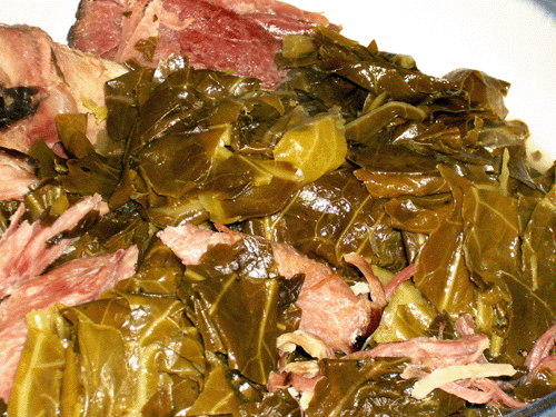 在超市裡﹐葉子大得可以當煽子的Collard greens﹐總是被綁成粗粗一大梱﹐梗子又粗又硬﹐纖維條條分明。頭一個過年看到大熊熊抱回來這一包﹐真是毫無頭緒﹐無從下手。心中暗想﹕小時候不是好像看過母親用同樣的菜葉餵鴨餵鵝﹖這東西真能吃嗎﹖
