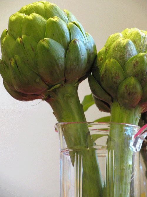 前陣子忙昏了頭﹐有三個星期只靠冰箱冷凍櫃的食物渡日。好不容易上週六得空了﹐趕緊上Wegmans補貨。一踩進超市大門﹐就看到一顆顆碩大厚實﹑翠綠綠的Artichokes佔據在最醒目的中心地帶向我微笑招手。忍不住靠過去挑兩顆投緣的﹐抱走