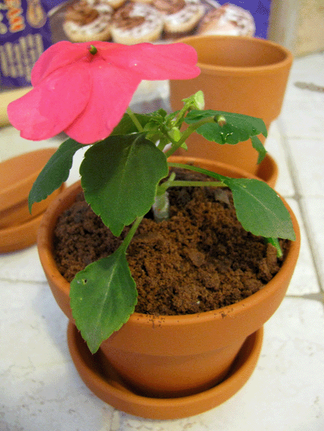 回家後也到花具店買了幾個陶土小花盆回來演練一番。下回有人到我家作客﹐我也請客人吃土。![]()