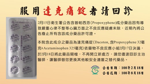 2/15衛署含普帕西芬(Propoxyphene)成分藥品預告廢證,服用此類藥物的患者速回診。