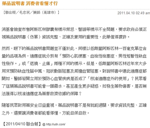 4/9聯合晚報載消基會抽查市售18種阿斯匹林腸溶膠囊標示部分,呈現「禁忌」、「警語」標示不全,強調政府必須正視藥品說明書(仿單)資訊完整、正確及實用的重要性,並應參考《藥事法》第59條要求業者以明顯的字體 (套色)、較大的字級來標示警語,此舉值得讚許。