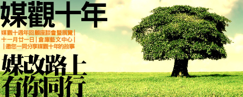 這個週末(21)就是成立媒觀十年的活動,工作人員正不眠不休,如火如荼的準備著,除了反思媒改運動的座談,我們也整理過往的歷史照片及相關檔案,同時也整理了台灣這十年來媒體改革運動的重要歷程,這些都會放大或貼在展示牆上。我們沒有邀請政商巨賈,我們邀集了媒觀的志工及好朋友分享我們的生命經驗。歡迎各位朋友一起來。