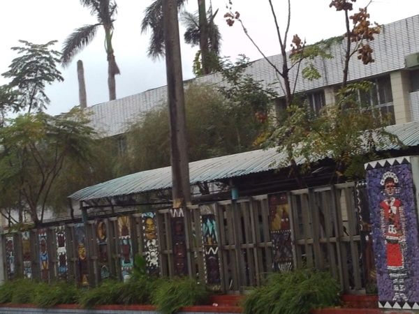 過米棧,古道口酒罈造景頗有意境;路旁原住民塗鴨,可愛有趣。