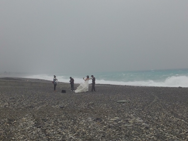 一入眼,七星潭海灣壯闊,風吹得猛,白浪滔天,波濤洶湧,滾滾浪花奔騰襲來,濤聲豪氣澎拜,是冬日的關係吧!站在這裡,空氣冰涼,濕氣凝重,浪花激起茫茫一片白霧,籠罩前方山邊朦朧,微雨輕霧的場景很適合一個人孤單的心情。沿著步道走不過數尺,海風強勁,幾乎讓人無法站立,岸邊居然有一對新人在此攝影,新娘禮服露肩無袖,看了讓人直打哆嗦,愛情真偉大,祝福新人白頭偕老,不然今天這一切真是好傻好天真啊。岸邊礫石鋪陳,潔淨無暇,引人駐足,七星潭真得很美,來過花蓮幾次,居然錯過這裡,過去究竟都去了哪?只
