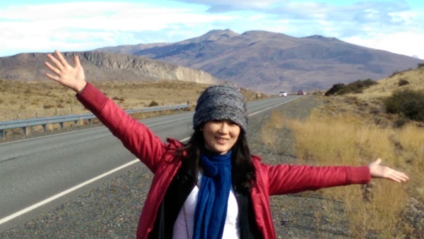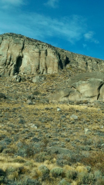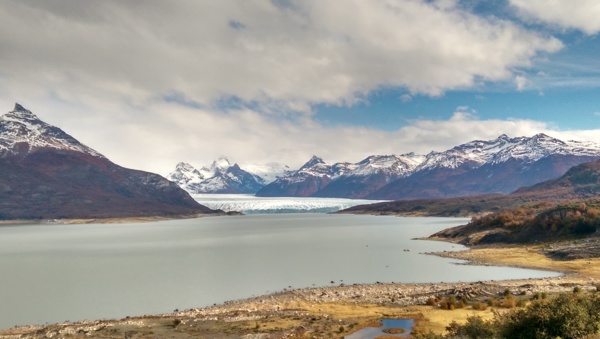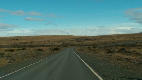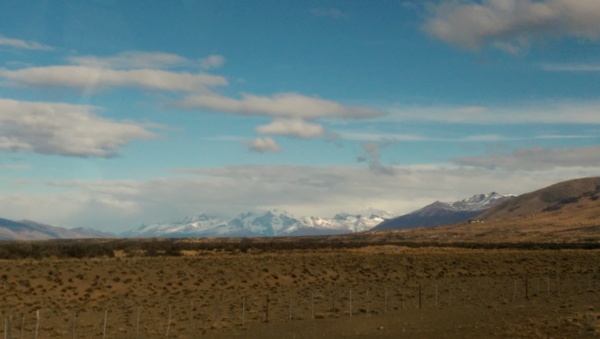 下機轉搭巴士,車子行駛在巴塔哥尼亞11號公路上,平原黃土空曠遼闊,視野無邊,蒼勁荒涼;遠處,藍天白雲,天高地闊,純淨無瑕;山頭猶見未溶白雪,山下阿根廷湖蔚藍如海;公路綿長,山高路遠不見盡頭,兩旁偶見兀鷹駝羊,前方禿面山壁,初秋紅樹點妝,景緻多變。