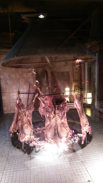 晚餐,入境隨俗,吃烤羊肉。La talilita外觀看來典雅樸實,據說是當地有名的餐廳,可一進門,就見整隻羊吊掛在熊熊烈火的烤肉爐架上燒烤,模樣有點嚇人。門邊擺放個橡木桶,桶上鋪滿花生,在等待入座時,正好打打牙祭,這個創意頗好。