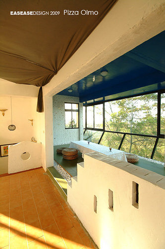 Olmo位於芝柏山莊內,是由一棟落破的別墅改建而成的餐廳。因為雨,沒能在戶外停留,看不出整個餐廳格局(部落格照片取自官網)。進門內有簡單的庭園造景,步道兩旁不知名小花開的茂密。一進屋內就看見招牌的磚窯正在熱爐,而窯可是老闆親手堆砌,窯上有個溫度計,專用來測量窯內溫度,窯邊堆放的龍眼木,就是柴燒披薩好吃的秘密,據說龍眼木在燃燒的過程會自然散發出果香氣,加上窯烤的高溫,披薩會比一般電烤做法的多了份美味與酥脆。餐廳比我想像中大,分樓上樓下兩層樓,老板招呼我們上二樓,感覺空曠卻似乎少了什麼,沒特別佈置也沒多餘的裝璜, 桌椅擺設很平常,調味籃的調味罐有些草率,服務生送來的Menu也只是簡單薄薄的一張輸出紙;看似玻璃的壺,拿起來後才發現是塑膠做的,跟期待想像中的話題餐廳該有的格調有點落差,但可能本來就是我們想的太多,這家餐廳是以披薩著名,東西好不好吃才是重點。知道我們餓,老板先送來麵包,麵包可口, 軟硬適中,還有多種口味,可惜麵包都吃完了,該給每個人沾橄欖油的盤子卻還沒上,是我們實在太餓?還是老闆的動作太慢?仗著人多不愁,我們一口氣點了店內所有口味的比薩,大概有七八樣。在Beatrice建議下,我們選擇換坐有一大片落地窗景的和室,窗外目光所及是一片綠光森林,樹影遠近高低,深淺不同;風吹搖曳,樹枝拍打窗面,雨滴順著窗沿流下,雨天也有雨天的美。服務生這時送來沙拉,味道還不錯但也說不上特別,因為生菜我一向吃不多,也吃不出好壞,很難對它有所評價,印像中的賣相倒是不錯。趁著上主菜空檔,下樓四處晃晃。樓下的飲料吧檯,看的出老板巧思,紅磚包覆抬座,牆面黃澄點點,透過滷素燈光映照,感覺溫暖;一樓餐廳設計的頗有質感,靠窗的餐桌上鋪蓋藍色桌布,搭配紅色透明窗紗,窗外還有一園老板親手栽種,隨時可供作食材的香草植物,饒富趣味。