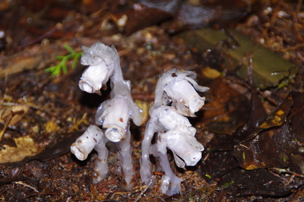 神木群蒼勁挺拔高聳參天,經數百數千年風霜雪雨,依然傲然屹立,在細雨輕霧的籠罩下更顯空靈脫俗(請自行配上悠悠笛聲耳邊響起)。園區裡的神木多是紅檜與扁柏(怎麼分? 忘記了),外型各異其趣,樹齡年代有別,為易於記憶,以相對應的歷代名人聖賢為名,於是我們看到了手持拐杖的孔子、被閹割的司馬遷、擁有男性雄風的包拯、女人味十足的班招,還有曹操、諸葛亮、王昭君等,走在濕滑的木棧道上,像是穿越時空,我是女主角,隨時會跟密林裏的古代英雄相會。但現實就是現實,導覽大鬍子一路吆喝催促我們必須趕緊向前,手拿IPAD跟單眼的大嬸被關注最多,不過她也最辛苦,沿路幫我們留下了不少照片。大鬍子要帶我們去看私房景點,所謂的私房景點是生長在潮濕幽暗的森林下,讓人嘖嘖稱奇的水晶蘭。水晶蘭晶瑩剔透,花形似喇叭,全株透明白淨無瑕,即便它與我只有短短