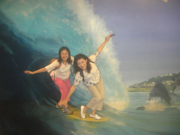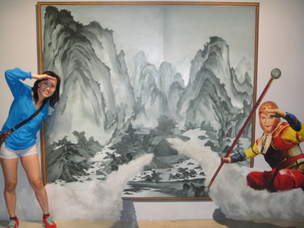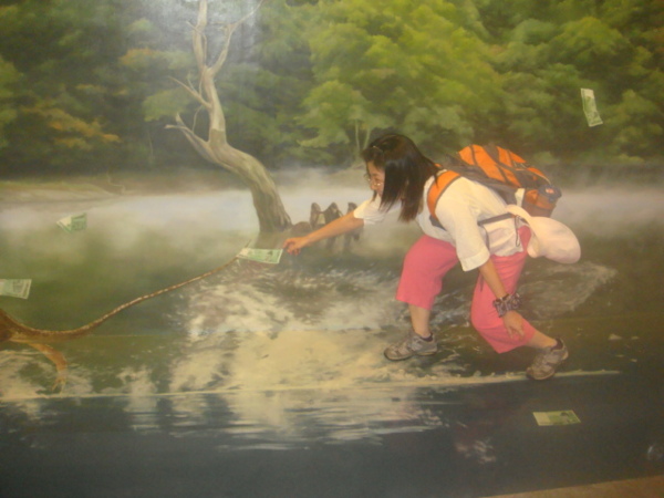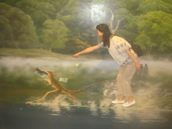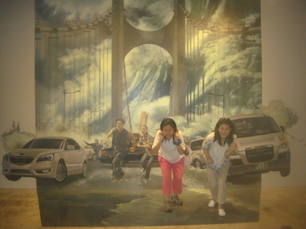 我們很快的往樓上的3D立體藝術館前進。這裡是顛覆平面繪畫圖像的一種巧妙設計,遠看平凡無奇的一幅畫,運用視覺的遠近距離、燈光折射的明暗讓圖像本身產生3D立體感,人在其中與繪畫本身融為一體,頗為真實,是殺底片的好地方,下面圖片可看出當中趣味。