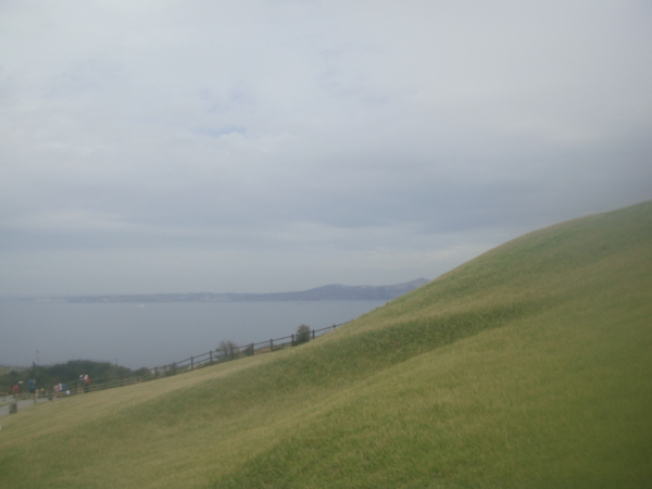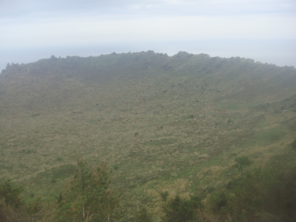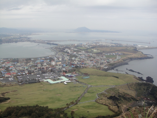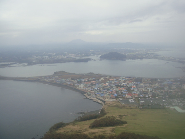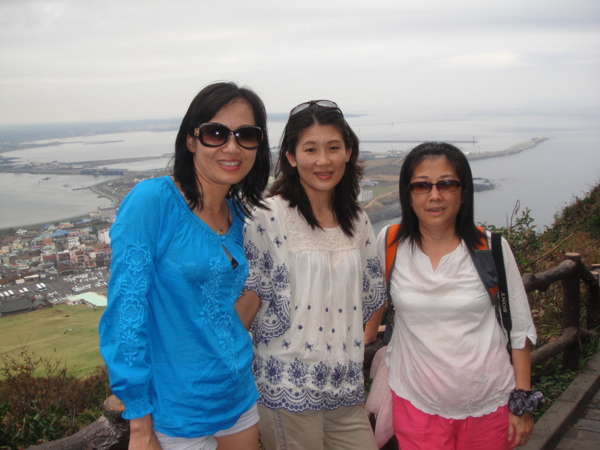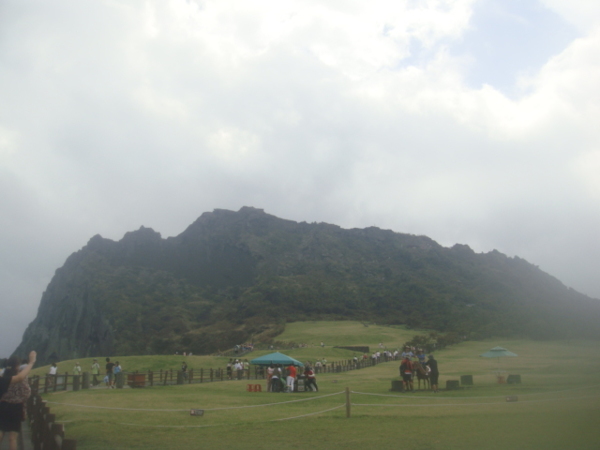城山日出峰是我們第一個拜訪的自然景點,位於濟州島東邊,是全世界突出於海面最大的火山口(到底世界上有幾個火山口是突出於海面啊? 關於它的背景故事有興趣者請自行上網搜尋),大石碑上刻著<<城山日出峰>>,斗大的中文字,讓人費解,為何要用中文? 韓國人不是很強調要用國貨? 不過這是一個讓人感覺舒服的地方,從山腳下往上望去,天很藍、山很綠、海很清、草原闊、空氣新。小李給我們一個小時的時間停留,為把握時間,我們幾乎是一鼓作氣的爬到山頂,小累。山上風景正好,遠眺山下小城,一間間的房子像小小積木,海面遼闊平靜無波,山頂上的觀景台正對火山口,一片綠油油,清風拂面,緩解一身疲勞。短暫停留後,又要趕路下山,這次是因要下山買特產,總得買些東西才不往此行。小李說在韓國是不給殺價的,因為韓國人覺得殺價是有失面子的行為,所以在這裡買東西,殺價沒用但老闆會送東西安撫你。這些話在我很自然的與老闆討價還價過程中從腦海裡冒了出來,那賣橘子巧克力的老闆真的堅持不二價,果真是送了一些散裝的巧克力,也是有趣。