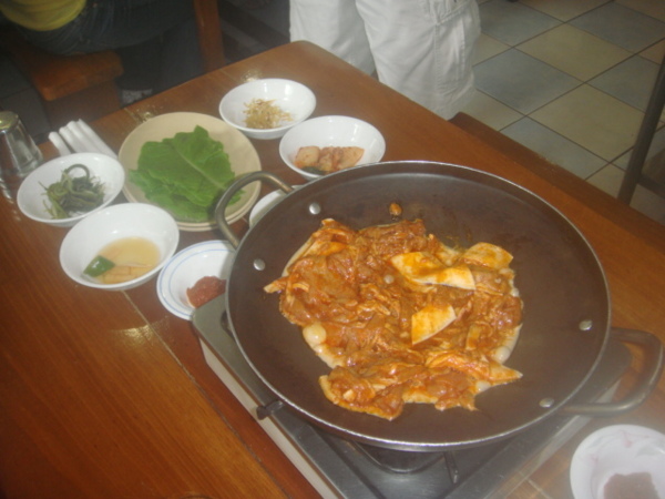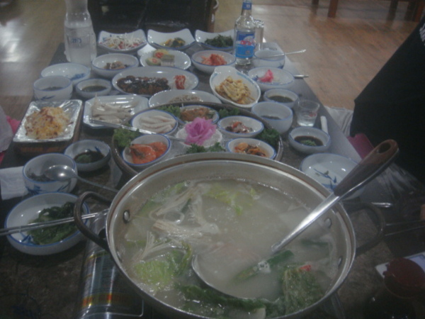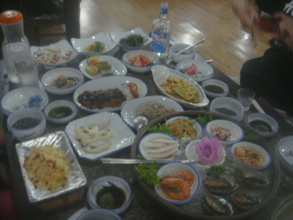 6:00 小李帶我們來到餐廳,晚餐吃的是生魚片加海鮮火鍋。菜色種類繁多,除了固定有的泡菜、海帶等小菜,生魚片、干貝唇、鮑魚、花枝、蝦子、海膽、炒飯、海鮮餅、墨魚粥、炸豬排、烤秋刀魚、青菜、起司玉米等,吃完一道又上來一道,我們如貴族般被服侍著。有圖為證
