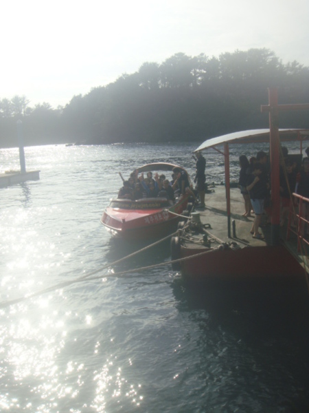 看完表演也已4點,小李給了我們幾個選項問我們想去哪裡? 我想了想,昨天船上介紹的柱狀節裡帶,就那裡吧。於是,我們又往那裡前進。但與我想像不同的是,我們是要乘坐快艇去,不是坐車也不是走路去。來到快艇碼頭,沒有一般碼頭的潮濕鹹味,水邊也無垃圾堆積,藍天碧海好心情,卸下身邊所有包包行李,穿上救生衣,我們乘風破浪去。快艇飛快的在海面上前進,比起海洋航行者號多了份搖晃顛簸,那船家似在為我們找尋刺激,時而甩尾時而傾斜,惡人無膽者如賈姬,心中一直喊救命。柱狀結理帶的形成是火山熔岩入海冷卻後形成的石柱堆積,黑色石柱或高或低前後迤灑海面一英里,乘船攬勝別有一番樂趣。還好回程時,船家良心發現,正常行駛於海面上,海也就一如往昔的變的美麗。
