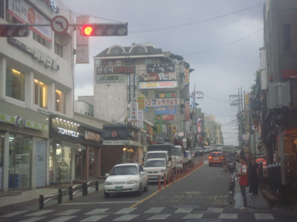 時間已近黃昏,我們最後一站在濟州購物大街閒逛,不壅擠不喧囂,安靜怡然的小鎮風情。在大街鞋店上買了一雙涼鞋,玩到現在,我的腳趾頭需要透透氣,呼吸呼吸。