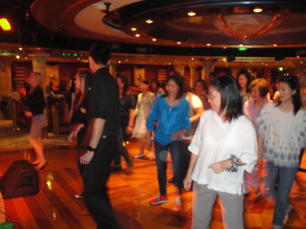 10:00又是跳舞運動的時間,晚餐吃太飽,動一動也好。在埃及艷后酒廊有sway舞蹈教學,教舞的是昨天舞台上的專業舞者,還有專業的樂隊伴奏。而所謂sway舞,就熟女的定義就是有人帶就會跳,沒人帶就忘掉的一種舞。舞廳裏都是人,跟著老師隨著音樂一起搖擺,跳的好或不好不重要,開心就好。