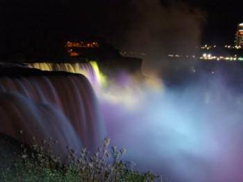 遠遠的還沒看到瀑布,就聽到轟隆隆的瀑布聲及聳立的多倫多CN燈塔,站在國與國的邊界,感覺很是奇妙,可能是因為身在海島的台灣,四周並無相連的國家,所以對僅有一橋之隔的兩國人民如何互動甚是好奇。而越接近瀑布就越能感受到它的壯麗,美國的確是一個觀光資源豐沛的國家,加上適度的開發與設計,照就它川流不息的旅遊人口與可觀的觀光收入。在導遊的安排下, 我們首先搭乘霧中女神號參觀神秘的新娘面紗瀑布,船的名字取的很美,但船本身一點都不美,加上每人身上ㄧ件俗氣的藍色雨衣,實在跟天然的美景有天壤之別。但當船身緩緩前進,讚嘆的驚呼聲不時響起,白茫茫的一片水幕彷彿新娘面紗自天空狂潟灑溢,人在船上無處可躲,天空中盤旋飛翔的海鷗;浪花千層與陽光折射後映照出的彩虹,形成動與靜之間最合諧的一種天地美景,顧不得水花四溢,快門聲此起彼落,大自然的美令人懾服。