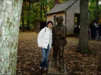 隨後, 我們趕往康科特最著名的 Walden pond 華爾騰池(更正確的說法應該是湖),親身感受梭羅在湖濱散記裡的ㄧ物ㄧ景。 華爾騰的美與淨, 套用梭羅自己的說法是 「沒有任何石頭可以打碎的鏡子;沒有任何風雨和塵埃可以模糊它常新的鏡面」; 散文家艾默生在他的日記中也給華爾騰起了一個脫俗的名字,叫 「神 之 滴」( God’s Drop), 由此不難見他的獨特與美麗,它是上天給波士頓人最好的一份禮物。沿著湖邊人行小徑,我們來到了梭羅獨居木屋的遺址, ㄧ個斗大的木牌寫著「 I went to the woods because I wished to live deliberately. To front only the essential facts of life. And see if I could not learn what it had to teach and not, when I came to die , Discover that I had not to lived ~ Thoreau 」(我步入叢林,因為我希望生活得有意義,我希望活得深刻,並汲取生命中所有的精華。然後從中學習,以免讓我在生命終結時,卻發現自己從來沒有活過-梭羅),這一段文字說明了梭羅當初移居於此的心境及寫下湖邊散記的過程,儉樸的梭羅用他的隨筆告訴大家,簡簡單單也可以享受豐富的心靈生活。坐在湖邊 ,湖光山色,清風徐徐,自己一人。