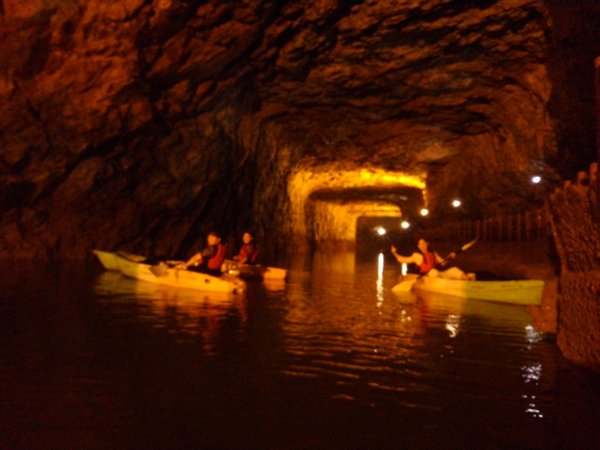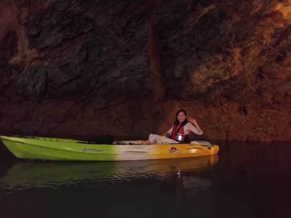 昨天的坑道,人潮散盡後的靜寂還留有戰地的蒼涼;今天的坑道,多了船家的吆喝聲,立馬變成觀光旅遊勝地,從戰地到勝地,這一路轉變也不過短短幾十年而已。 在坑道內划獨木舟是走遍全世界都沒有的旅遊體驗,我們一人一船,船家認真的講解划槳技巧及注意事項,個人突然覺得有點難,會不會翻船啊? 可一下船,練習了幾下,也就上手,獨木舟很輕,划槳不需太用力,保持平衡就可以,左前右划,右前左划,前進後退只是順逆時鐘划槳方向的不同,偶而碰到岩壁也不至於擱淺,船家熱心的跟隨我們巡航,幫我們拍照,服務滿分,這$250花的很值得。但划久了手還是很累,我體驗過即可,不想多划一圈,選擇上岸走一趟步道,感受當年辛苦的國軍弟兄,用血汗打造出的鬼斧神工之作,近距離觸摸都還可感受到花崗岩石的堅硬,而這坑道面積如此深廣,當初工程之艱鉅可以想像,對於在風聲鶴唳的年代,犧牲的官兵,只能在內心深深的行一鞠躬禮。