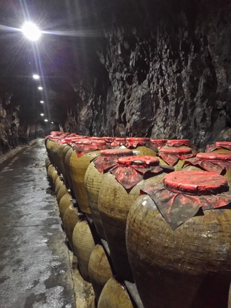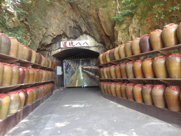 坑道位於一座山壁下,入口處的酒罈牆很難讓人不注意。我們剛停好車,一位阿伯大聲疾呼,入內參觀手腳要快,因為11點半要準時休息,看看手錶,時間差不多11:20。一近坑道口,一陣濃烈酒香撲鼻,一陣涼意來襲,這裡是天然的冷藏室,馬祖窖藏老酒芬芳的秘密就在這裡。坑道並不太長,潮濕冰涼,主要通道存放排列整齊的罈裝老酒,剛招呼我們的阿伯熱心的要幫我們拍照,這可能是阿伯的工作之一,這時又進來一組遊客,阿伯更要他們把握時間,離休息時間只剩幾分鐘而已,然後很準時的,阿伯趕人關門吃飯去,留我們在門口繼續拍照取景,Rachel喜歡跳起來拍,本人沒多大興趣,還好有個Pauline陪她一起,但我實在不懂,跳起來拍到底有趣在哪裡啊?這時突然想起,我的手機套還遺落在坑道裡,這下糗了,那是手工訂製的個人款,價值$1600啊! 這該如何是好? 正在傷腦筋時,剛來那組遊客的導遊,很熱心的要幫我去載阿伯回來開門,他是當地人知道阿伯每天固定在哪休息,借了我們的機車,他就這麼去了,馬祖人真是善良又熱情啊。這時又來一組客人,但門已關,我們也只能叫他們外頭拍拍照或下午再來。不久,阿伯悻悻然回來了,嘟嚷了兩句,就開門讓我進去,但就是不讓向隅的遊客進入,說休息了就是休息,原則堅持的很徹底,阿伯面惡心善,載他來的導遊想騎車再送他回去,阿伯大手一揮,不必了。馬祖阿伯超有個性。
