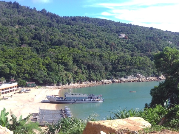 一樣騎回海岸線,晴空萬里,陽光下的的碧海顯著格外耀眼,過仁愛村,遠處媽祖神像高聳矗立,在藍天白雲青山綠樹的映照下,神聖美麗(圖下)。又繞進馬港,只為了捕捉白日下的馬祖箭牌(圖下)及天后宮攝像,十足觀光客行徑。順著媽祖宗教園區的指示牌,一路騎入立有<<禁止進入>>的小徑,路底施工處,工頭不讓我們上山,他們正在搶蓋媽祖神像外的觀景平台,觀光客別來亂,但我們不放棄,保證一定不進入施工區,工頭也就勉為其難的同意。在毫無遮蔽的山坡上前進也是一種酷刑,但山坡上視野遼闊,海面風平浪靜又是一處天然美景。來到媽祖神像下,祈福坑道的媽祖神轎映入眼簾(圖下),原來在旅遊書上看到的鑽神轎可祈福的媽祖廟就是這裡,真是得來全不費工夫,既然可以祈福,當然不能錯過,硬要在這裡拍照留念。但我書只讀了一半,所謂的祈福是要走完坑道,這裡的坑道是連接上頭媽祖神像的後側,只在神轎下鑽進鑽出應該是沒甚麼效果,這也是回來後上網查才知道的,唉,一知半解真是一件可憐的事。但現場近距離觀賞神像真的很壯觀讓人心生崇敬,媽祖神像高29.6尺,正好是馬祖的面積,<<媽祖在馬祖>>成了馬祖戰地風情外,最具特色的觀光口號(圖下)。