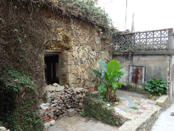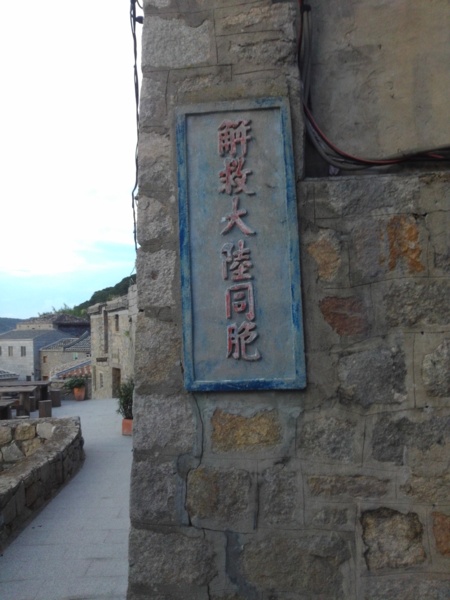 北竿,很靜;芹壁村,很美,但與想像中有落差,聚落依山面海,石造建築方正,花崗石牆;沿山勢搭建,高低錯落有致,石色質樸,與天地山海融為一體,寧靜協調。我們住宿的<芹壁村25號>,是老宅修建的民宿,內部木頭構造,外部花崗石牆,分上下兩層,上層是房間,下層是共用衛浴,對習慣現代化的都市人而言,梳妝盥洗要帶一堆東西上上下下的挺麻煩,傳統復古體驗一次就好。這裡的地址不好找,門牆上的標語倒不少,用標語取代門牌號碼倒是個可行的辦法,例如,我問了民宿主人,傳說中芹壁村14號的海盜屋在哪? 主人順手一指,說:刻著<軍民一家>的就是(圖下),這裡還有<蔣總統萬歲>、<解救大陸同胞>、<光復大陸>等間。我們隨意在聚落中逛逛,又見天后宮,這不知是我們經過的第幾間廟,看的出信仰在這裡的份量,這可能也是馬祖人這麼純樸善良的原因。