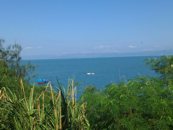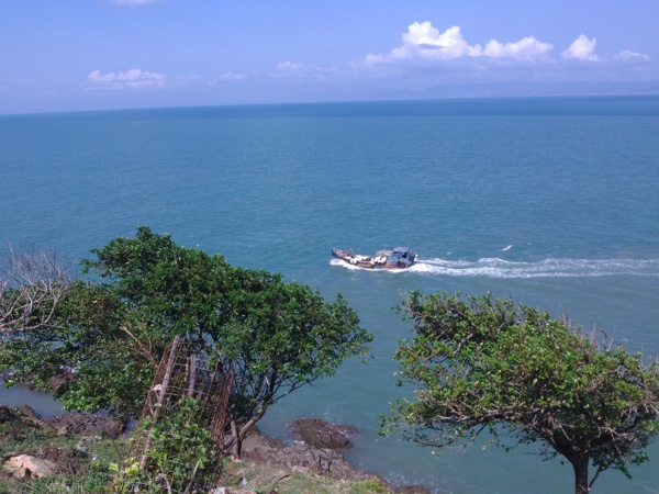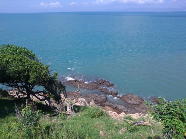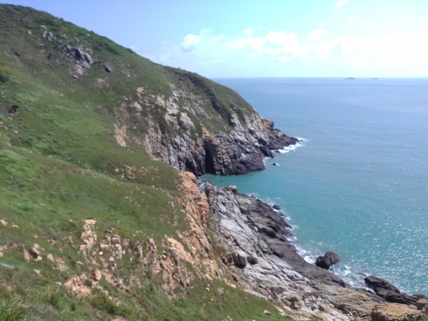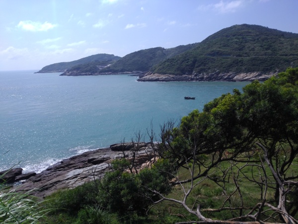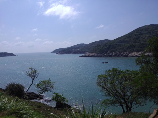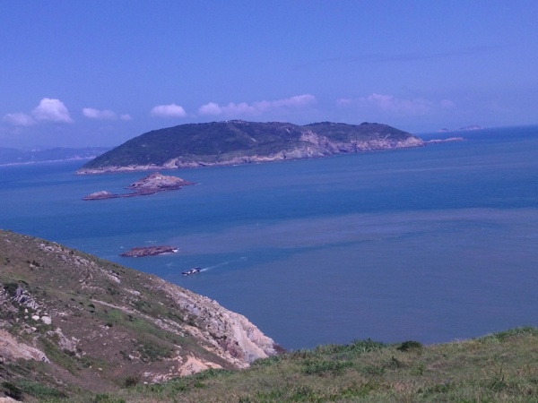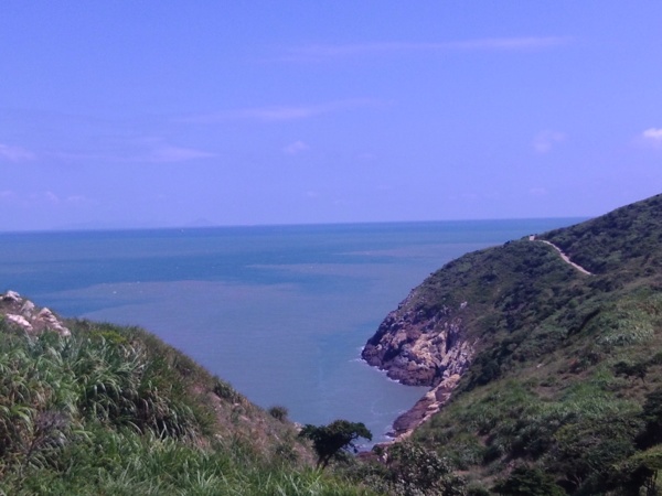 船靠岸,碼頭上的大坵兩字醒目,船家提醒我們兩個小時後開船離開,務必準時回來。順著步道往上爬,藍天豔陽,蔚藍海水,青山綠樹,景色無邊,才停下來拍照一會,再回頭,所有人都鳥獸散。來到島上的指示牌前,一邊是往民宿,一邊往白馬尊王廟。大紅廟身隱身叢林綠蔭,鮮豔搶眼,廟後方是陰涼的林蔭步道,本該往這走,但人多,我往民宿方向去。過民宿不久,有條石階步道,在這又遇到另一群人,於是我選擇直行走景觀步道,但一路無遮蔽卻是我始料未及。自然景觀步道沿路視野遼闊,海天一色,湛藍海面層次分明,大小島嶼錯落,舟來船往,風光旖旎,美不勝收。遠眺前方,是大陸,僅視線所及的距離,一水之隔,數十年之遙,但天氣實在太熱,不適合傷春悲秋,走在大太陽下,前無人後無影,沒曬出人乾,也快脫水了,找了一陰涼處稍坐歇息,眼顧四盼,心理納悶,走了快一個小時,梅花鹿呢?