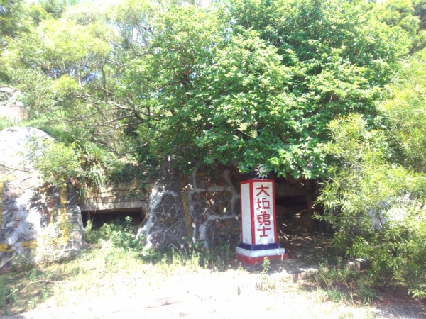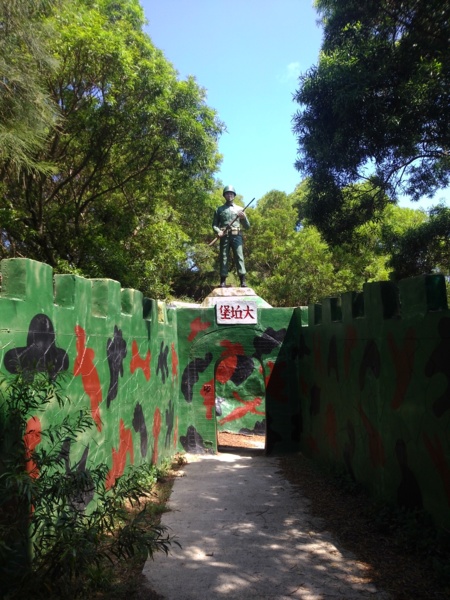 慢慢走回到民宿前的涼亭休息,遇到跟我搭同船來的大哥也在休息,隨口問了問,看到梅花鹿嗎? 他說有,好多隻。我臉上馬上浮出三條線,”什麼,大家都有看到,就只有我沒有”?大哥走的是民宿後的石階步道,我一整個不服氣,雖然離開船時間只剩20分鐘不到,我發揮百米速度,衝上那條被我遺棄的石階步道。來到一處指示牌前,一邊是大坵堡,一邊是百年桐樹,我往大坵堡走,這裡的路與樹盤根交錯,斑駁的碉堡,殘垣斷牆的學校,永遠的大坵衛兵,守護一片荒涼與孤寂,而頭頂的艷陽與盎然的綠樹卻又如此生氣勃勃,這裡究竟代表著過去還是未來? 我喜歡這個地方,為甚麼只能停留2個小時? 我終究還是沒有看到梅花鹿,是預留下次再來的伏筆嗎?