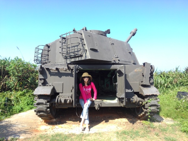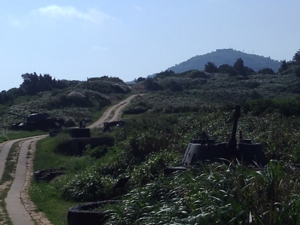 來到08據點,有Pauline想看的戰車,山頭上曠野一片,天蒼蒼海茫茫,風吹草低見大砲,戰備跑道兩旁擺放多種軍中除役武器,砲口一律向對岸,但肅殺氣息已不在,武器反倒像是大型裝置藝術。