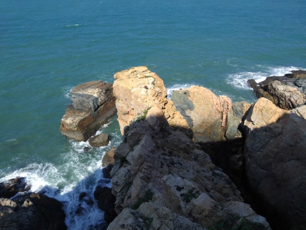 06據點,藏身在美麗海岸下的險峻碉堡,入口有二處步道相通;步道階梯陡又長,一路向下延伸,有一種要走入海裡的錯覺。往沒有標示的那條入口走,步道臨嶙峋峭壁,無屏障護攔,拾級而下再下,聽海浪拍擊岩壁發出的怒吼聲,看眼下洶湧波濤的浪花撞擊,前後只有我一人,再怎麼藝高人膽大,此時也會膽戰心驚,深怕一個風起,整個人被吹落海裡,喊救命都來不及,就此回頭。這裡的陡峭險峻,當時的戰火對峙,這裡留下了痕跡,但我的拍照技術拍不出這裡地勢的驚險,可惜。