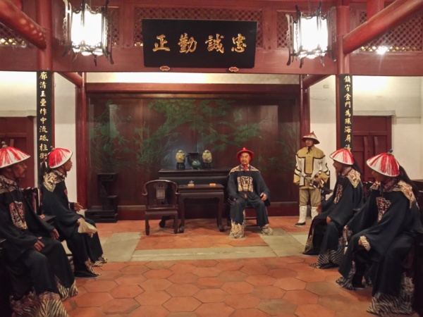 ※ 總兵署,習稱衙門口,古裝片官府審判,小民喊冤的場所,自清代以來,一直是金門最高行政機關。庭前寬闊,老榕遮蔭;大堂內保留原始形制,兩旁立有肅靜、威武、迴避、出巡等立牌,公堂之上,軍師在旁,現代女子坐官椅,學做縣太爺的威風;地下一樓是地牢,蠟像犯人栩栩如生,一旁展有古時奏則及犯人名冊等,書法字跡功整,文字線條優美。大堂後是總兵大人的居所,擺設陳列仿古,蠟像逼真,重現當年景象,後院有棵木棉古樹,樹齡已數百。