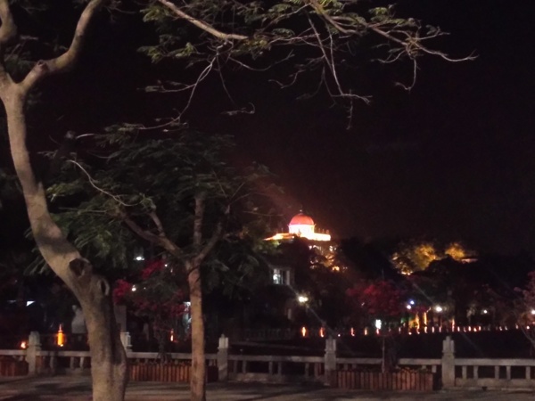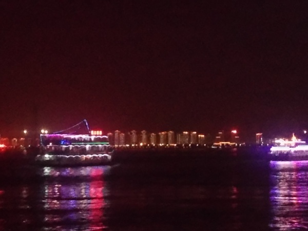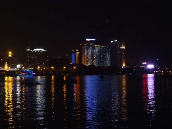 新朋友Leo提議要去鼓浪嶼喝一杯,雖然是明天的行程,今晚就先踩線。搭渡輪,江上觀看岸邊一整排高樓飯店,燈光熱鬧,遊船霓虹閃爍,映照江面五彩繽紛,我們所住的飯店,特別是那一棟,燈光變幻,在夜黑下散發高貴溫暖。