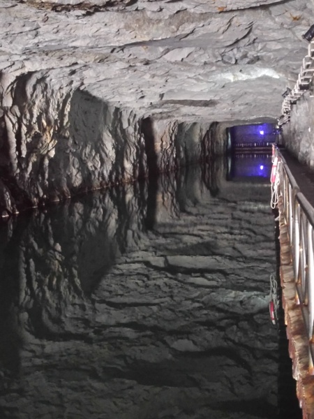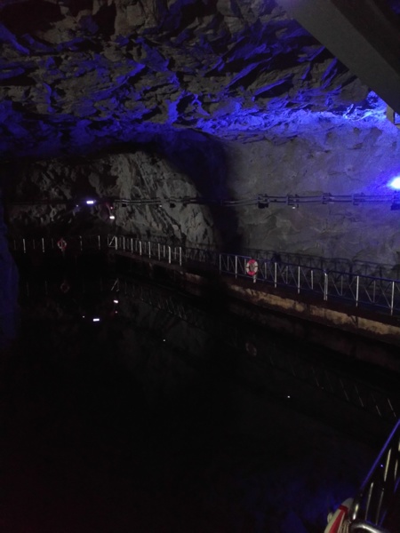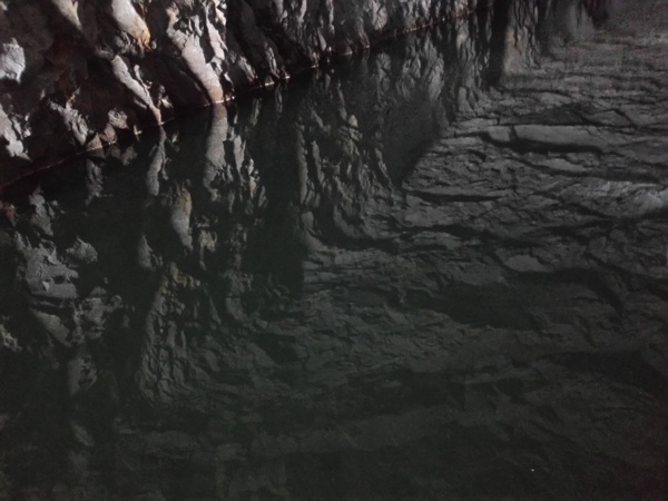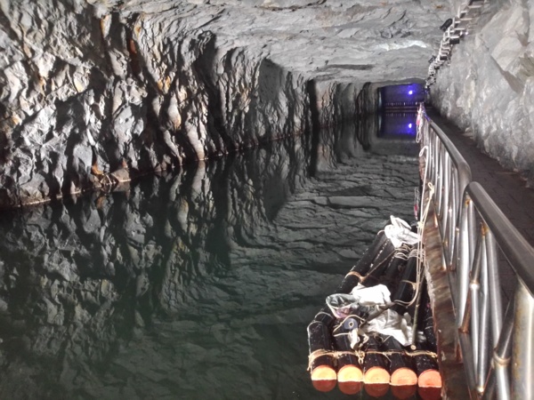 本來,在馬祖拜訪過許多坑道後,對於這裡的坑道並無太多期待,想著同一個時代的弟兄打照出的花崗岩坑道,哪會差異到哪去。但一入內,發現我錯了,英勇國軍打造的雄偉壯闊及鬼斧神工或許沒有太多不同,但開放觀光後兩地所呈現的的風格卻完全不同,簡言之,馬祖坑道保留較多原始,而這裡賦予坑道新生命。翟山坑道分前段坑道及後段水道兩部份,坑道長約101公尺,明亮、寬敞、在燈光照映下,花崗岩壁一斧一鑿所留下的痕跡看得更清晰。走到底,是通往水道的門,往內走是頗有斜度的一段階梯,階梯兩旁加設鋼製的扶手圍欄,說明這裡從戰爭到和平;從戰地到勝地的轉變。進入水道區,藍光映照坑道深邃迷離,洗盡煙硝後獨留幽靜,水道呈A字形,長357公尺,左右各有一出海口,越往外走,光線越明,坑道水面透徹清晰,宛若明鏡,倒影花崗岩壁如真似幻,畫面像3D立體電影,水深幽幽,憑欄凝視,不禁手腳發軟。走出坑道,日正當中,11月的陽光猶強,遊客中心買水正好可稍事休息。