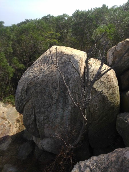 這裡林蔭遮天,巨石磊磊,但沒能引起我們多大注意,古崗亭後方立有立牌說明此處的石謁群,我們一古腦的逕往山上走,想一探石謁群模樣。小爬上山對我與旅伴都不是難事,只是行到山窮處,石謁不見一個,倒是在視野無遮蔽的大石上,登高眺望古崗湖,風景更上一層樓。就在我們即將起身離開之際,眼尖的Tina發現我們所在的大石旁有模糊題字字跡,心喜應該就是這裡了但又心存疑惑,這顆石頭實在不足以代表<群>啊! 我們到底在哪裡錯過? 再回到古崗亭,Tina又把石謁群指標研究一遍,照指標標示位置,古崗亭附近應該就有,靜心一找,還真發現不少,對於過去工具闕如的年代,如何能在如此堅硬岩石上刻出如此功整字樣,我與旅伴都有滿腦子問號,這裡的磊磊巨石都藏有奧妙,其中崩落的<漢影雲根>原石也在我們腳下,字跡顛倒,根字已斷裂遺落,僅留漢雲影,殘缺無<根>的巨石,怎似魯王一生呢?