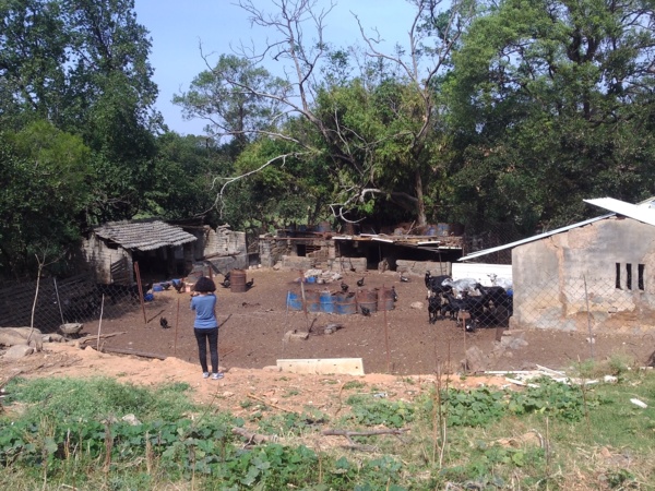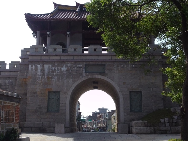 來到北門口。灰白古樸的花崗岩石城樓,分隔城裡城外兩個世界不同,城外是現代社會,城裡彷彿跌落時空黑洞,來到穿古裝的年代。蔚藍晴空,路上人車稀落,四周寂靜。一旁農家,綠蔭山丘凹處,圈地養雞養鴨養鵝又養羊,第一次看到這麼多不同家禽被養在一起卻和諧安樂,好一幅<農家好>景象。