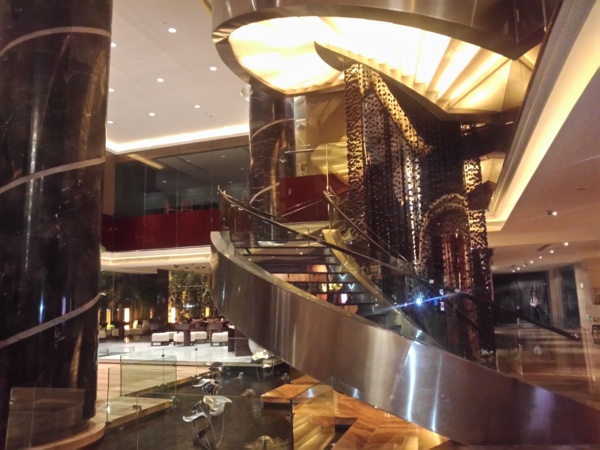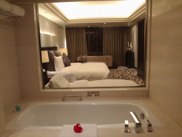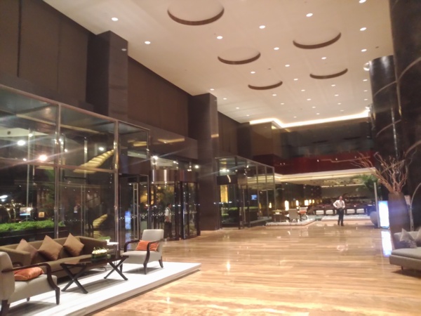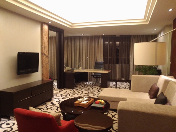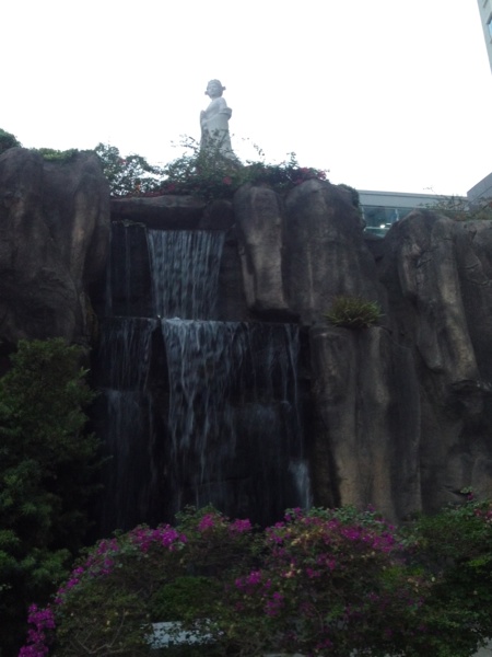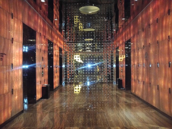 入境廈門,轉搭公車來到輪渡碼頭站。碼頭位在鷺江道15號,住宿的瑞頤飯店Swiss international 就在鷺江道12號,該是過個馬路就到了,飯店簡介也是這麼寫。於是扛著沉重行李大膽邁開步伐往飯店前去。可事情都不是憨人想的那麼簡單,祖國的地大物博又再次讓我們吃了苦頭,以為短短的一段路,卻負重的走了快30分鐘。還好選擇住宿五星級飯店,辛苦終有代價。飯店大樓外觀簡約現代,戶外咖啡區有假山瀑布及一尊高聳的觀音像;大廳內寬闊挑高,裝潢設計豪華氣派,觀光客有走進上流社會的感覺,住宿27樓海景行政套房,專人專屬樓層check in,還有行政酒廊全天候免費供應飲料及小點,我們一行二人順夾帶一位新朋友,把握時間,晚餐就先在這裡解決。房間面積約三十餘坪,一廳一房兩衛,大方舒適,花錢買享受,偶爾選擇做個有錢人,感覺很不錯。
