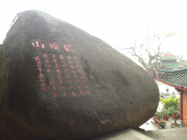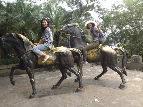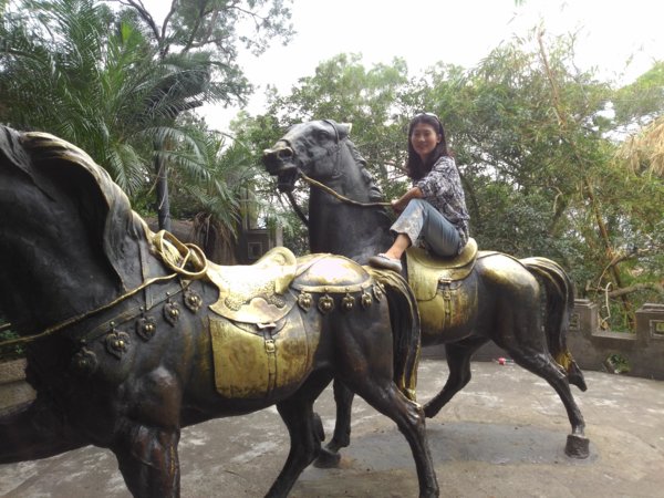 順著階梯向下,石壁林間穿梭,幽雅清靜,一處水操台,是鄭成功當年整軍治兵的遺跡;沿路石壁上盡是紅色題刻,字跡蒼勁,用來精神喊話亦或抒發心情? 在山林毓秀下,成了特殊一景。看來廈門金門真的很相近,處處鄭成功,處處留有石謁群。Tina突發現兩匹青銅馬,馬背發亮,活靈活現,立刻上馬做英雄,效法鄭成功,在此玩了一會,是最佳拍照地點。山路下有日光岩寺,弘一大師曾在此修行,設有紀念園區及大師雕像供人膜拜。