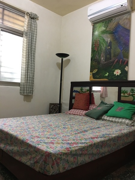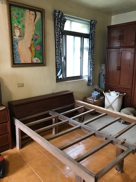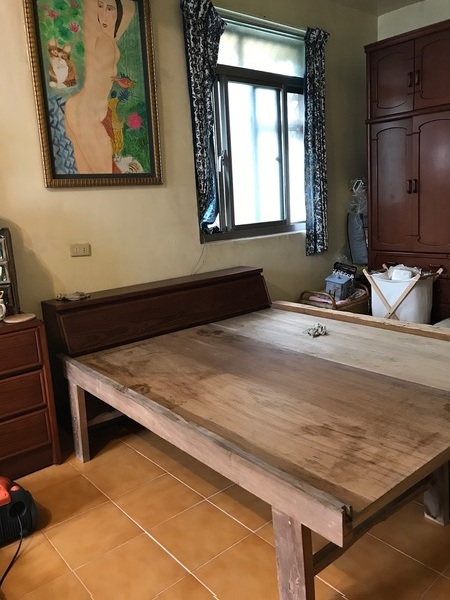 本來打算買新床,討論之後,決定把二樓主臥房的床搬下來,老公再利用平時儲存的材料--拆解的老瞑床,重新組裝一張床,放在主臥室。為了簡約,不買床墊,只舖棉被。