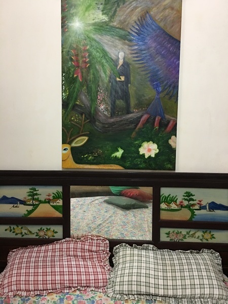 老公可厲害了,找出一塊老瞑床的床頭板(上面有鏡子和玻璃鑲嵌圖案)替代,床頭上方掛我的畫「聶隱娘的魔幻異想世界」裝點,床頭與畫作色調十分協調,就像事前特別訂製的,真太神奇了。